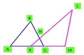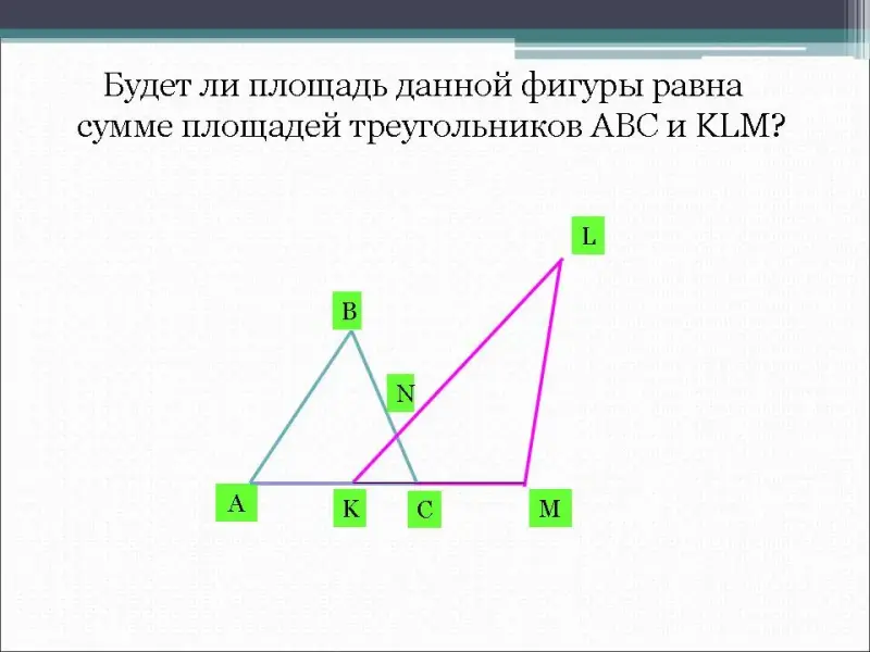 Б) - Будет ли площадь данной фигуры равна сумме площадей треугольников АВС и KLM? (Cлайд 3)