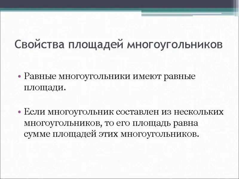 - Назовите основные свойства площадей многоугольников?