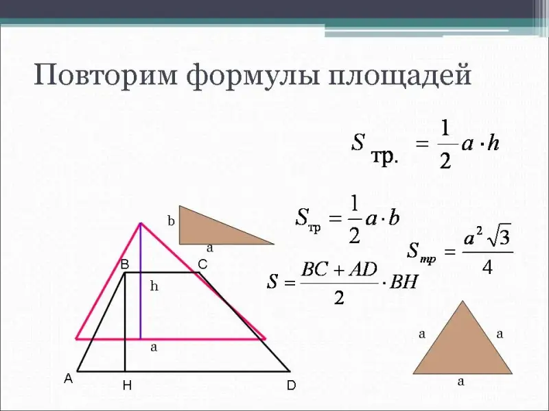 - Давайте вспомним формулы для нахождения площади фигур (квадрата, прямоугольника, параллелограмма, ромба, прямоугольного треугольника, равностороннего треугольника, трапеции).