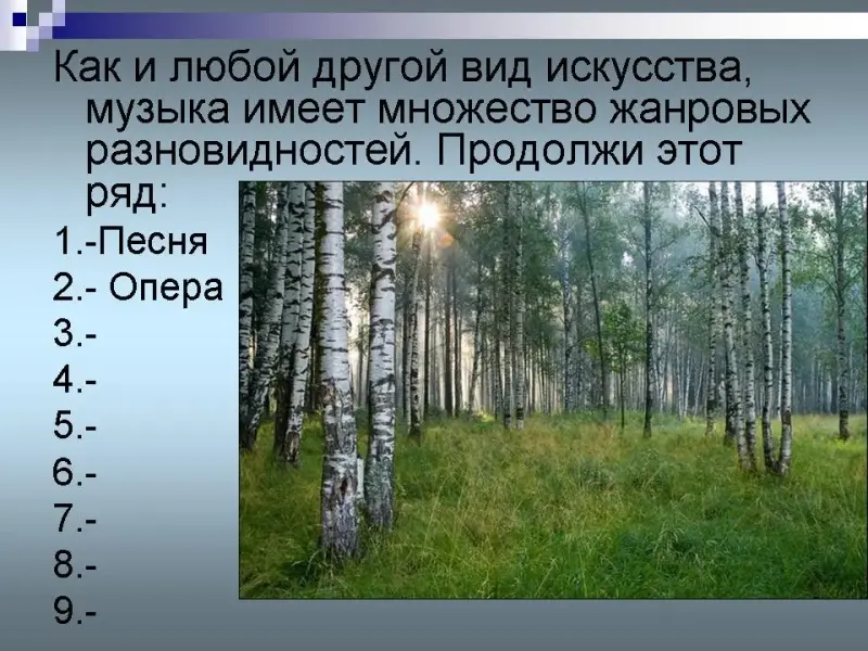 Как и любой другой вид искусства, музыка имеет множество жанровых разновидностей. Продолжи этот ряд: