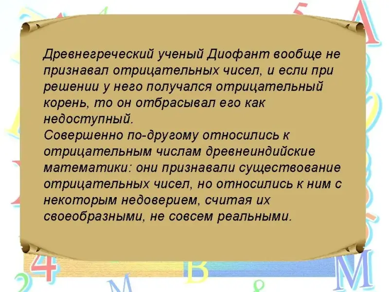 Древнегреческий ученый Диофант вообще не признавал отрицательных чисел, и если при решении у него получался отрицательный корень, то он отбрасывал его как недоступный.
