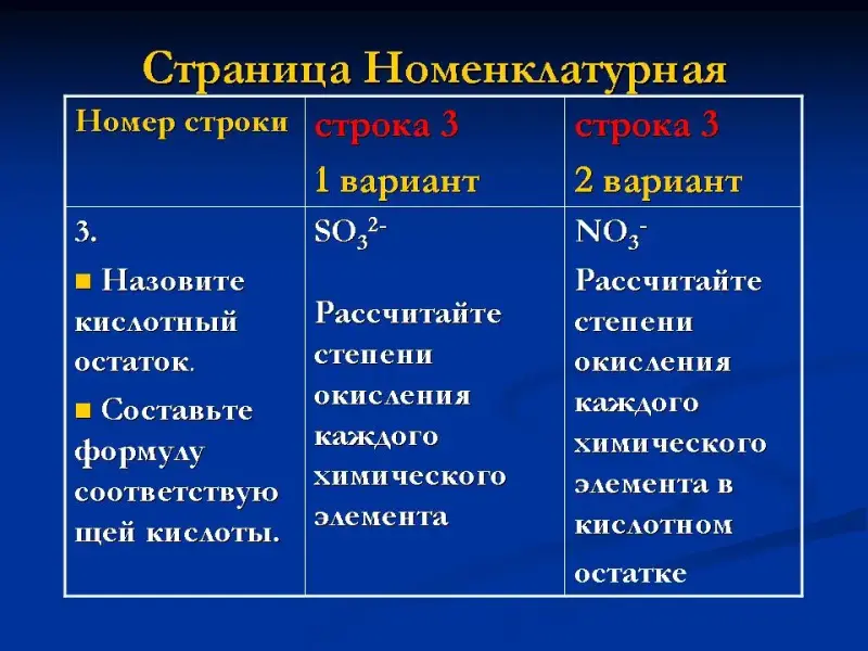 | 3. Назовите кислотный остаток. Составьте формулу соответствующей кислоты. Рассчитайте степени окисления элементов в ней. | SO32- | NO3- | CO32- | SO42- |