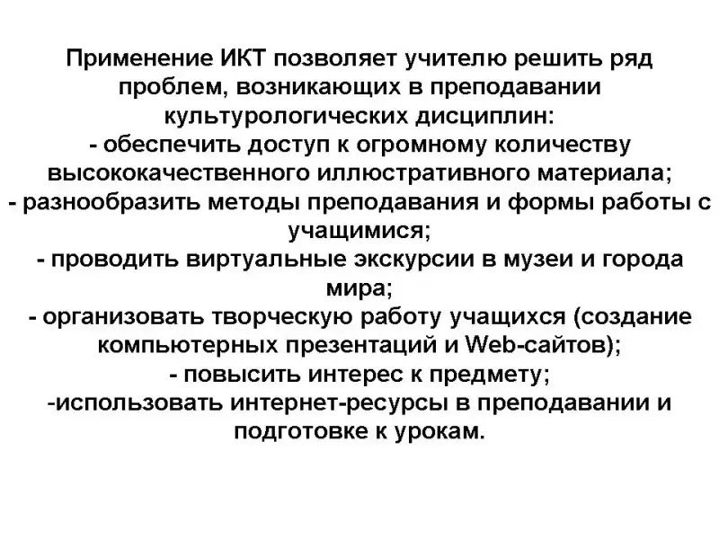 ИКТ дают возможность учителю и учащемуся самостоятельно подготовиться к уроку практически любого жанра: урок-прогулка, урок-концерт, урок-викторина, урок-импровизация, урок-интервью, урок-презентация, урок-бенефис, урок-репортаж, урок-панорама, урок-«живая газета» и т.п.; разнообразить виды деятельности на уроках, так как ученики и учитель становятся на уроке зрителями, слушателями, читателями, художниками, поэтами, писателями, исследователями, философами, режиссерами, сценаристами, дизайнерами и т.п.