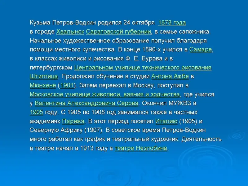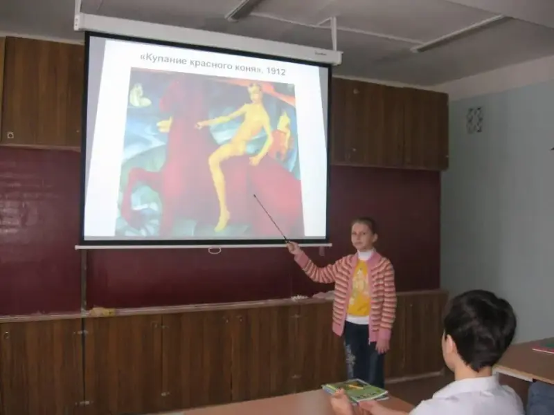 Интересно, на мой взгляд, проходят уроки - презентации, когда учащиеся знакомятся с жизнью и творчеством художников, скульпторов, музыкантов, режиссёров, актёров. Для таких уроков ребята создавали презентации (как коллективные, так и групповые) и представляли свои работы как репортажи, интервью, экскурсии. В конце таких уроков я предлагала ученикам почувствовать себя писателями, репортёрами, интервьюерами. Так, изучив тему «Он создал символ своей эпохи. Творчество К. Петрова-Водкина», они делились своими впечатлениями от картин художника.
