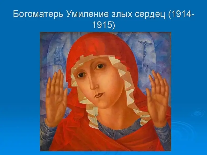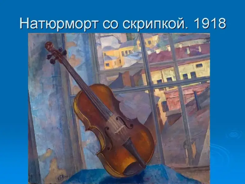 Вот что получилось: «Картина К. Петрова-Водкина «Натюрморт со скрипкой» написана в 1918 году. На ней изображена одинокая скрипка на фоне утреннего города. Скрипка - инструмент довольно грустный, и, глядя на картину, я слышу тихий мелодичный звук. Я как будто вижу одинокого скрипача в голубой комнате, и мне кажется, что ему очень грустно, потому что за окном зима, а он один. Но это нежная грусть, потому что звук скрипки схож со звуком падающего снега. А такая зимняя картина вызывает умиротворение. Мирошников Илья.» А Кульгавеня Катя написала: «Возможно, хозяева переехали в новый дом, а скрипку оставили за ненадобностью: ведь она же старая. Вот и стоит она, одинокая в углу окна, за которым виден двор, залитый лучами солнца, никому не нужная, брошенная всеми. А ведь совсем недавно дарила скрипка радость людям. Но люди часто бывают безжалостны.»