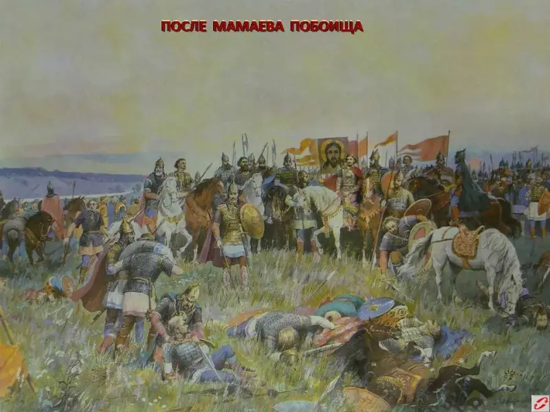 По преданию Сергий Радонежский благословил князя на борьбу с врагом. (слайд 9 )В помощь он отправил с Дмитрием Ивановичем двух богатырей - Пересвета и Ослябю.