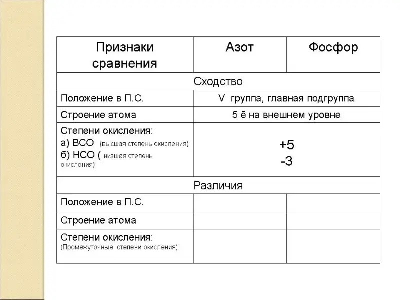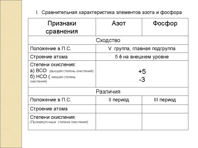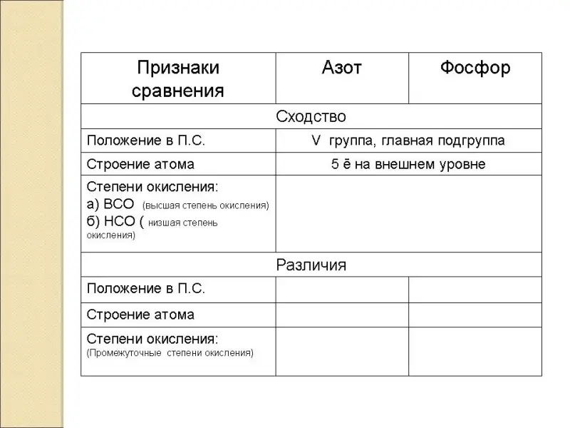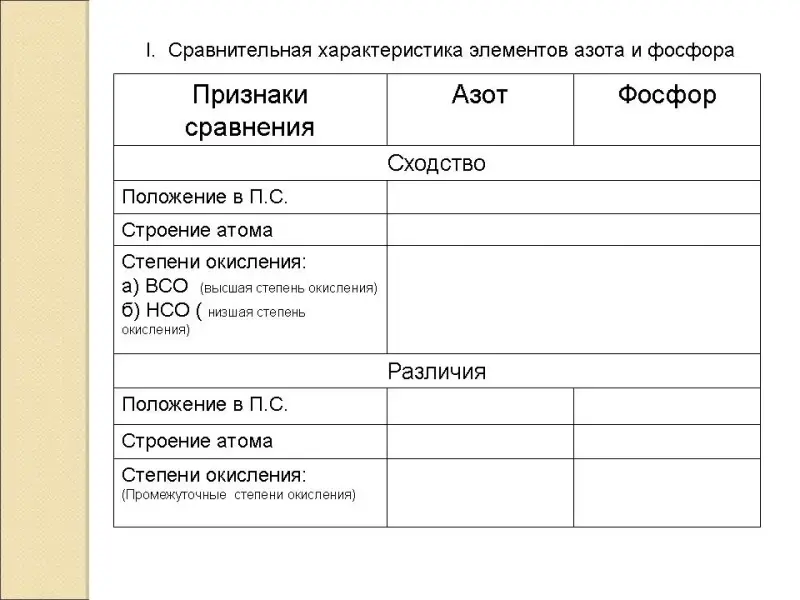 (Заполнение таблицы по сравнительной характеристике азота и фосфора на основании их положения в Периодической системе Д.И. Менделеева)