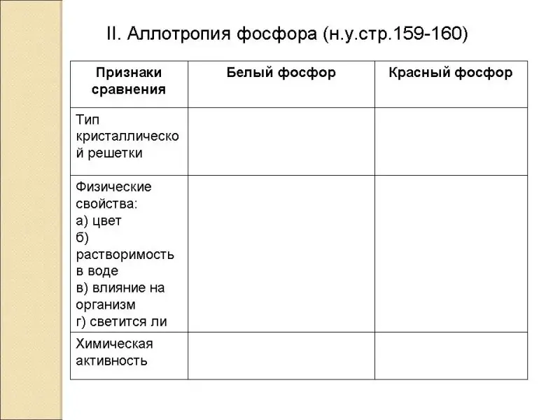 (Заполнение таблицы по сравнительной характеристике аллотропных модификаций фосфора на основании просмотра видеофрагмента, изучении отрывка из учебника и просмотра слайдов)