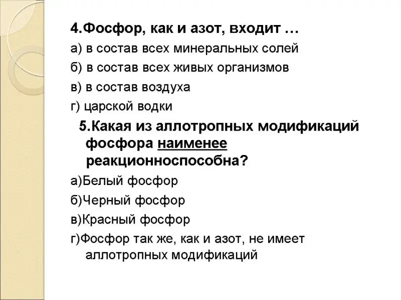 г) фосфор так же, как и азот, не имеет аллотропных модификаций -