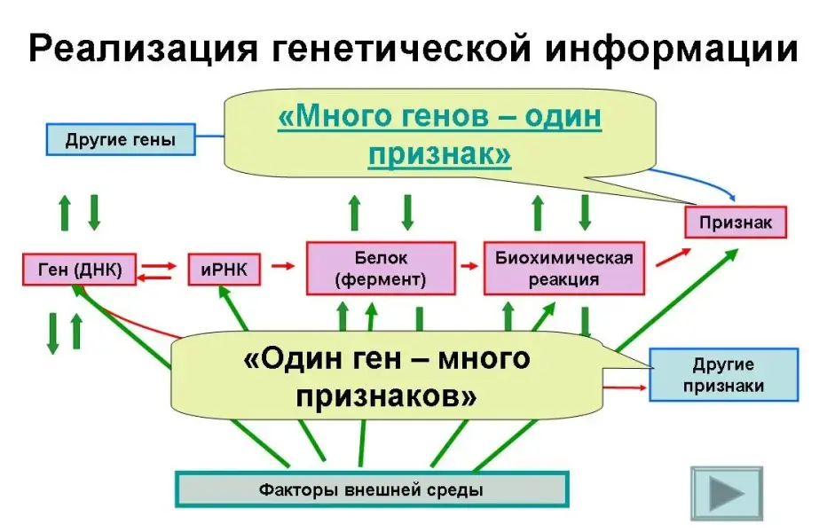 (С 25 слайда по управляющей кнопке переходим на 8 слайд, а с 8 слайда по гиперссылке "Один ген - много признаков", на 26 слайд).