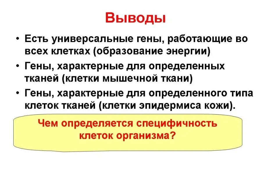 - Специфичность клеток организма определяется деятельностью определенных генов.