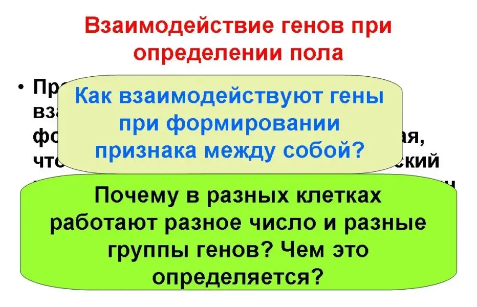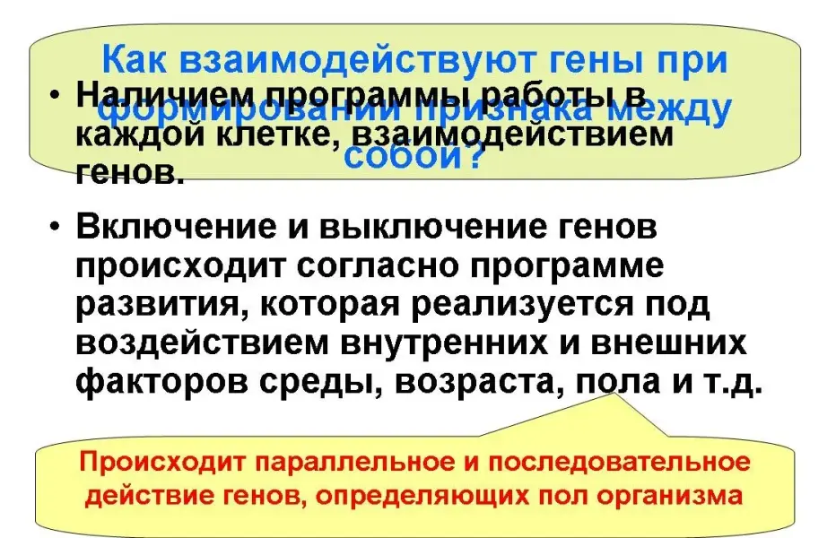 - Многие признаки формируются при взаимодействии нескольких молекул белков. Это механизм одновременного или параллельного взаимодействия. (определение пола)