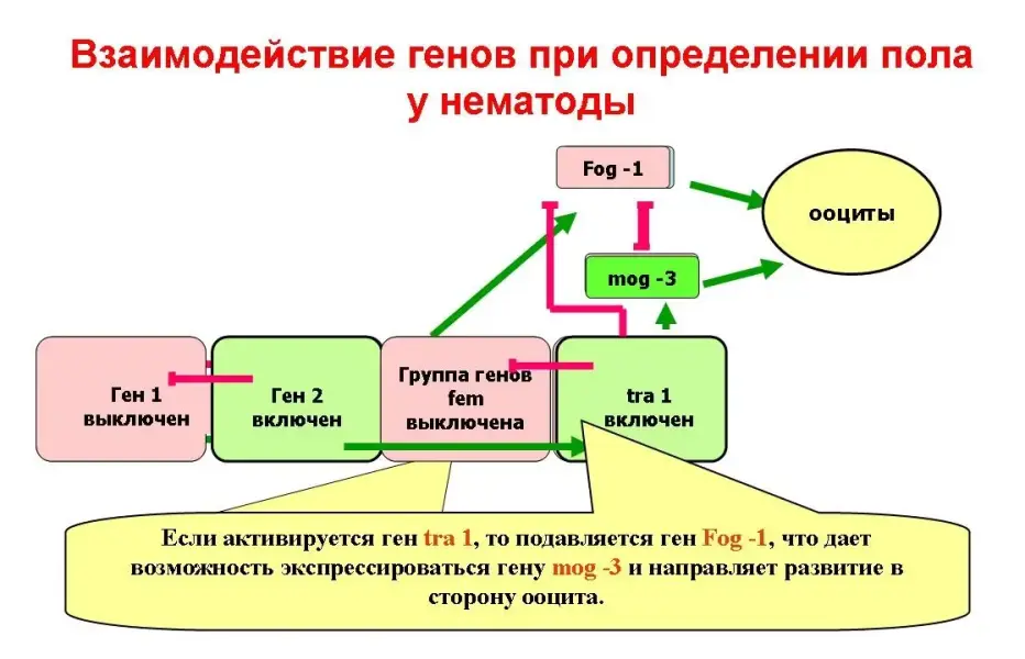 3. Чтобы подробно рассмотреть, как происходит включение и выключение генов, рассмотрим взаимодействие генов при определении пола у нематоды (слайды 12).
