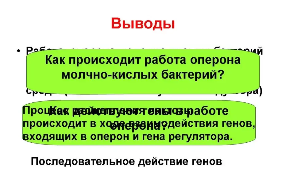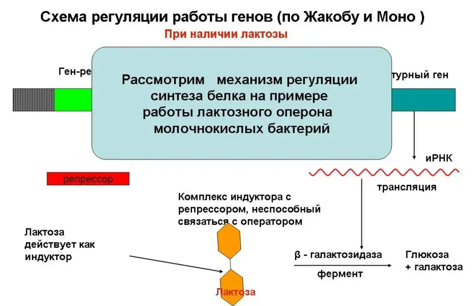 - Работа оперона молочнокислых бактерий происходит в результате деятельности белка репрессора и факторов внешней среды (наличие или отсутствие индуктора)