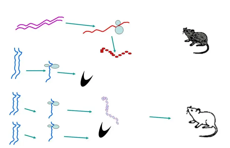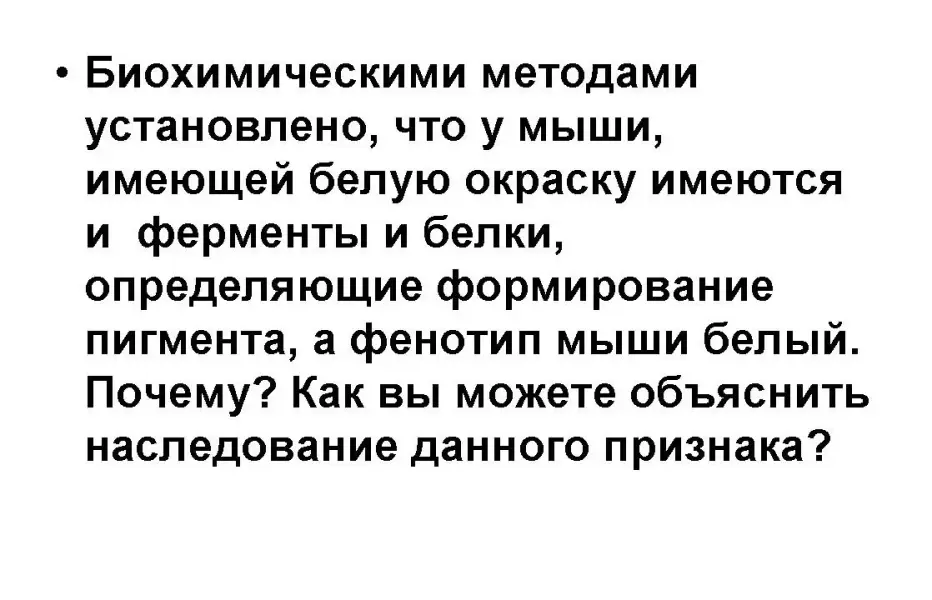 Биохимическими методами установлено, что у мыши, имеющей белую окраску, имеются и ферменты и белки, определяющие формирование пигмента, а фенотип мыши белый. Почему? Как вы можете объяснить наследование данного признака?