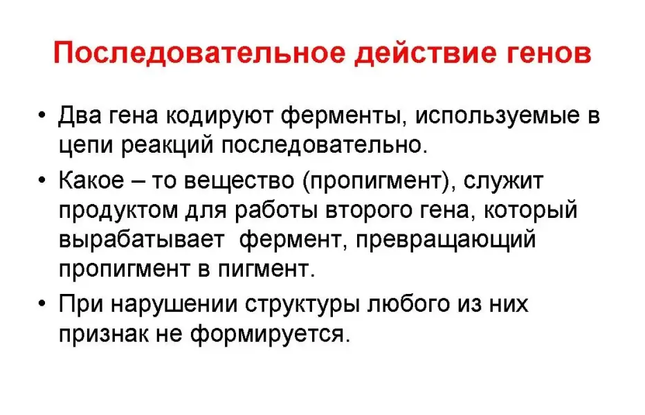 - Какое - то вещество (пропигмент), служит продуктом для работы второго гена, который вырабатывает фермент, превращающий пропигмент в пигмент.