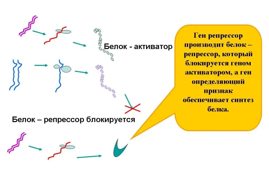 - Ген репрессор производит белок - репрессор, который блокируется геном активатором, или каким либо другим веществом, а ген определяющий признак обеспечивает синтез белка. (признак окраски мышей)