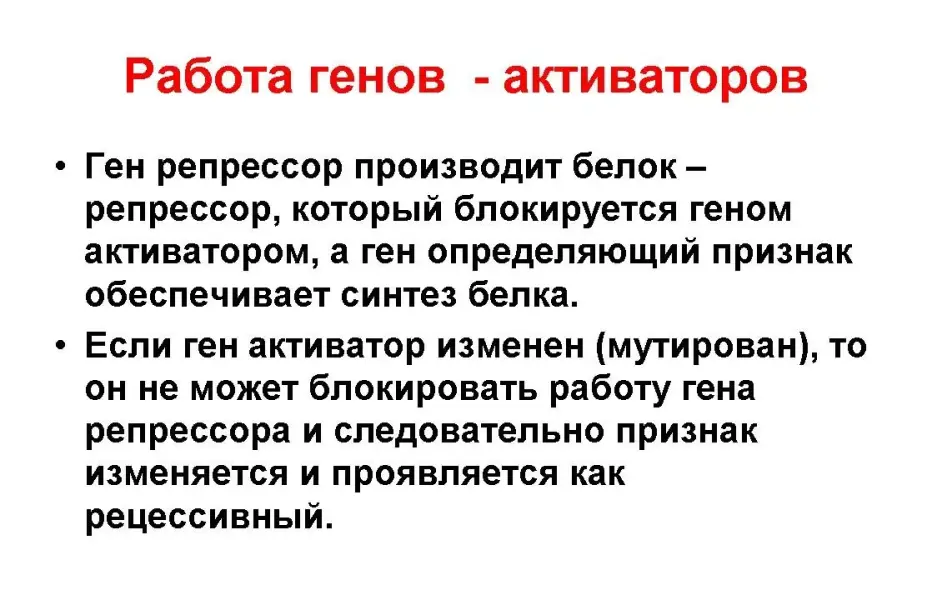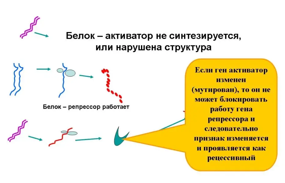 - Если ген активатор изменен (мутирован), то он не может блокировать работу гена репрессора и следовательно признак изменяется и проявляется как рецессивный. (Слайд 25)