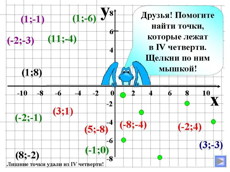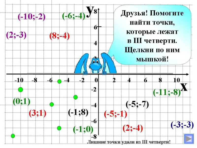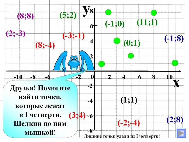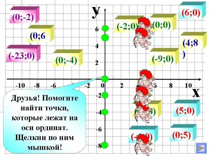 Мы поговорим с ним о том, какими свойствами обладают координаты точек, в зависимости от местоположения в координатной плоскости.