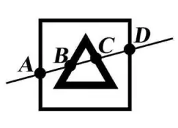 5. Начертить квадрат со стороной 3 см. Внутри квадрата начертить треугольник. Провести незамкнутую линию через две фигуры. Обозначить все точки пересечения.