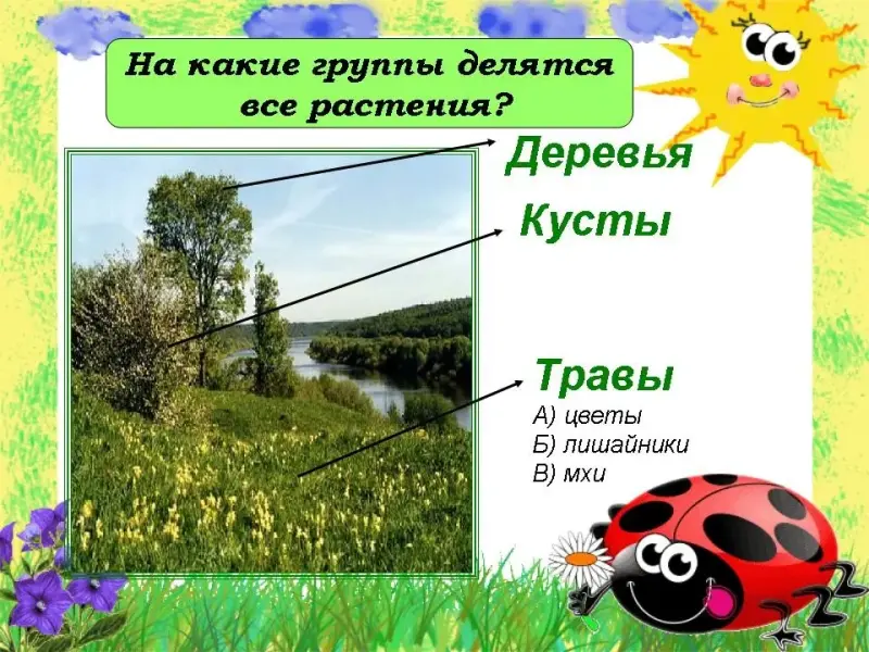 - На какие три группы можно разделить такие растения? (Деревья, кустарники, травянистые)