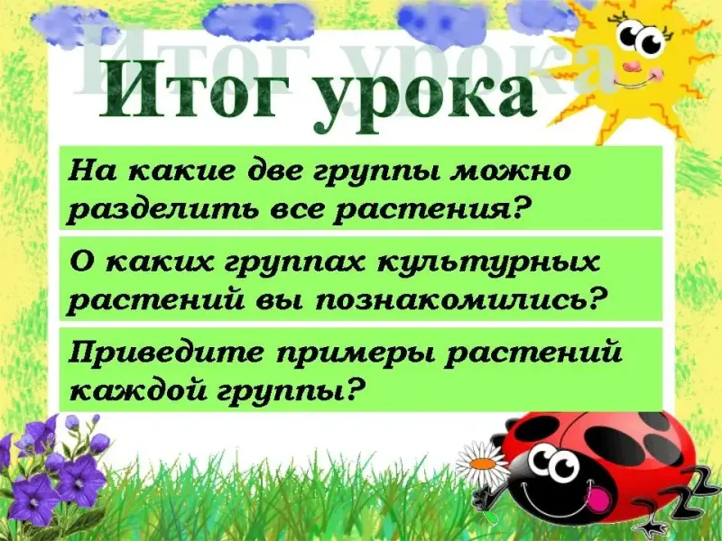Молодцы, ребята! Сегодня на уроке мы познакомились лишь с некоторыми представителями дикорастущих и культурных растений.