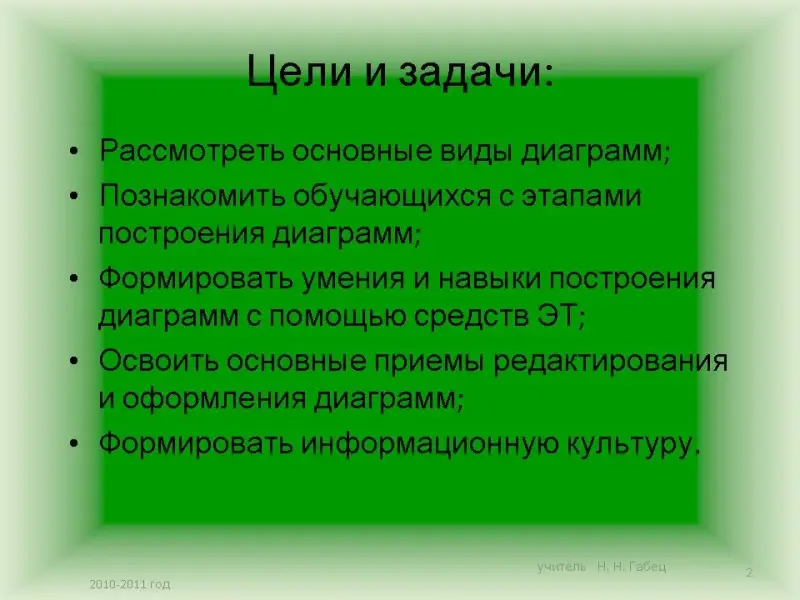 - научить учащихся представлять числовую информацию в графическом виде, познакомить учащихся с различными видами диаграмм в ЭТ;