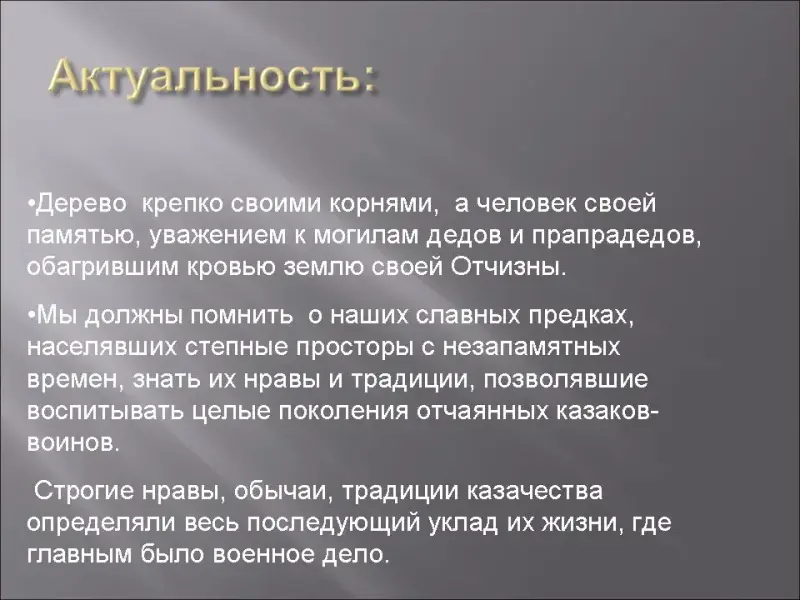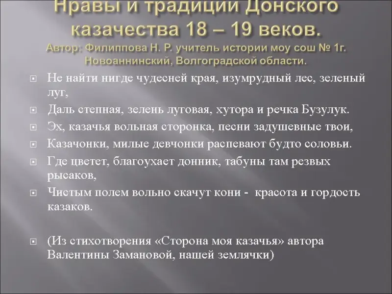 Учитель: Сейчас мы мало знаем о том, как жили казаки, об их нравах, обычаях, хотя живем на этой земле, являемся потомками тех героев, отстаивавших независимость своей земли. Нам есть чему поучиться у них. Но мы совсем не знаем об их прошлом.