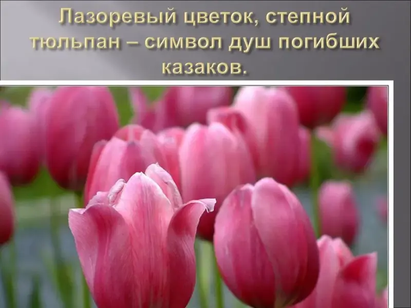 Много было пролито казачьей крови, по всей степи раньше стояли братские могилы, но время сравняло их с землей. В казачьих поверьях степную ковыль - траву считают травой мертвых, растущей на костях наших предков - казаков. Поэтому казаки никогда не рвут ковыль и не вносят его в дом. Есть еще одно поверье о "лазоревом цветке" - дикий степной красный тюльпан, распускающийся на короткое время в весенней степи. Не алые головки тюльпанов колышет ветер - это души казаков, погибшие в боях, походах на чужбине, распускаются на несколько дней в родной стороне, поэтому цветок лазоревый похож цветом на кровь, пролитую казаками. И сейчас, весной, в нераспаханной степи цветут тюльпаны, потому и называют казаки степь лазоревой, и исстари не рвут в степи цветок лазоревый.