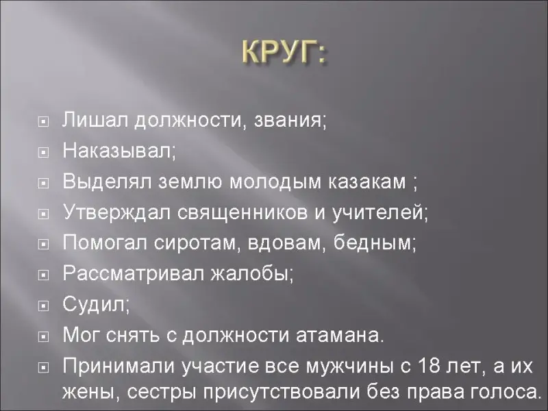Круг - общее собрание казаков, где решались все важные дела. Казаки собирались на площади, размещаясь так: атаман (не моложе 50 лет), за ним старики усаживались на скамеечки, потом женатые казаки, потом неженатые, не моложе 18 лет, а в последних рядах могли присутствовать только жены, сестры, невесты, пришедшие с казаками, но без права голоса. Круг собирался по зову атамана или по удару колокола, если судили атамана. При открытии круга атаман кланялся на 4 стороны: старикам и священнику отдельно. Круг решал хозяйственные, военные вопросы, утверждали учителей, священников, определяли помощь вдовам, сиротам, рассматривали жалобы, творили суд, принимали в казаки иногородних, и исключал из казаков. На круге решались вопросы о наказаниях. Наказанный Кругом должен был даже после порки поклониться на 4 стороны со словами "Спаси Христос, что поучили меня братья - казаки, неразумного". Если казака прощали, тогда кричали "Бог простит, не греши боле!"
