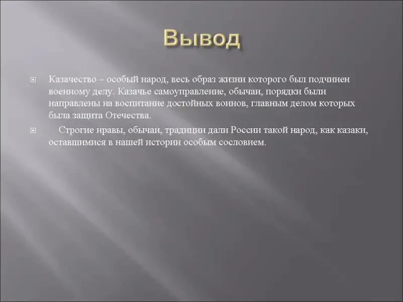 Вот такие они были - казаки. Изучая материал о казачестве, мы сравнивали современные правила поведения, и, к сожалению, это сравнение не в нашу пользу. Изучая историю нашего края, подробно знакомясь с обычаями наших предков, мы можем сказать, что казачество - особый народ, главным делом которого было военное дело, и вся система семейного и общественного воспитания была направлена на умение отстаивать свою землю с оружием в руках, на воспитание мужества, героизма, уважения к старшим, почитанию предков. Самым главным была Христианская вера, дававшая силу духа, потому были казаки бесстрашными, не боялись смерти.