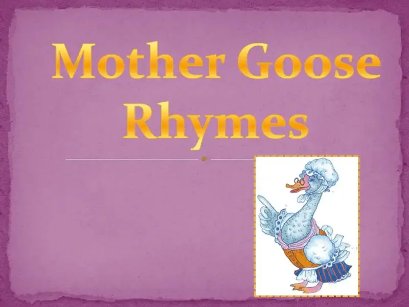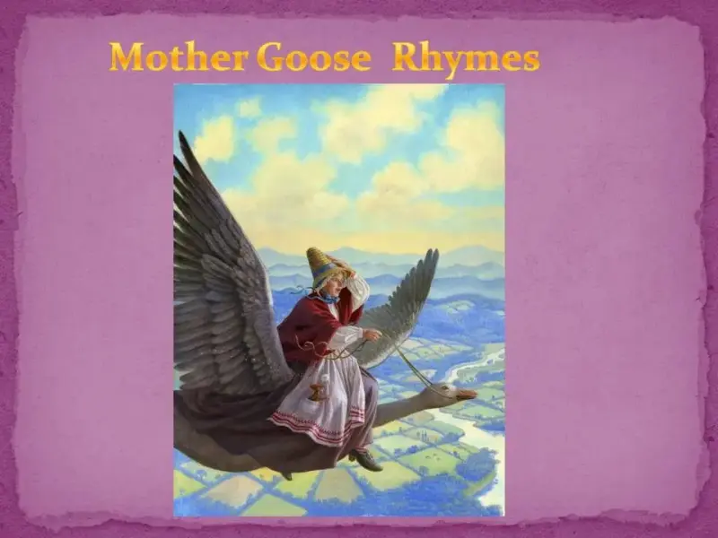 Ведущий 1. Все дети с детства знают Шалтая-Болтая, котяток, потерявших перчатки, Роббина- Боббина, трех мудрецов в одном тазу много-много других героев старинных английских детских песенок. В старину песенки, известные теперь под названиями "детских" называли "песнями матушки Гусыни", а порой "стишками матушки Гусыни" . (Mother Goose rhymes или Mother Goose melodies)