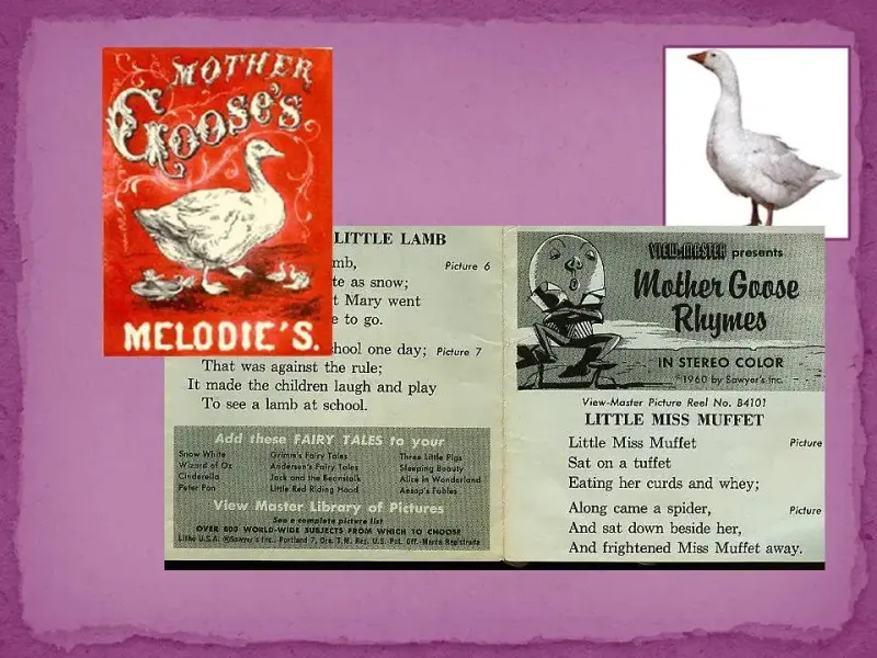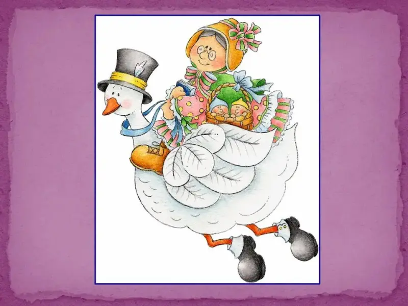 Ведущий 2. Возможно, название "Сказки Матушки Гусыни" появилось потому, что традиционной сказительницей в те времена была старуха-крестьянка, пасшая деревенских гусей. Начиная с 1780 года "матушка Гусыня" становится также известна в детской английской литературе как Мальчик-с - пальчик.