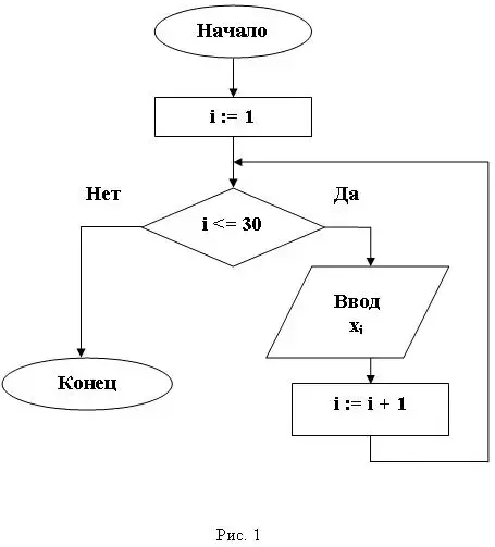 Введем одномерный массив Х, состоящий из 30 элементов, то есть необходимо ввести некую последовательность элементов Х1, Х2, …, Х30.