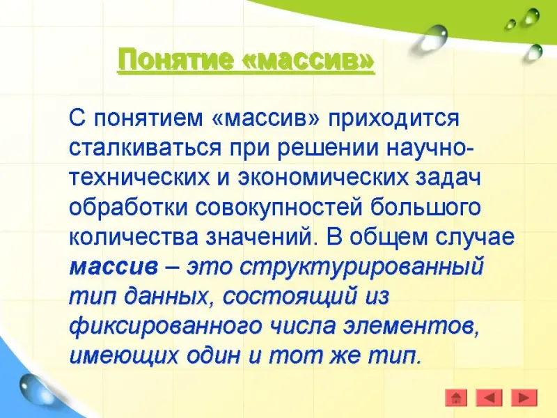 С понятием «массив» приходится сталкиваться при решении научно-технических и экономических задач обработки совокупностей большого количества значений. В общем случае массив - это структурированный тип данных, состоящий из фиксированного числа элементов, имеющих один и тот же тип.