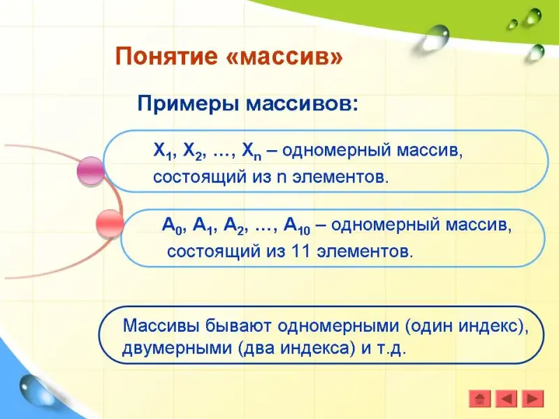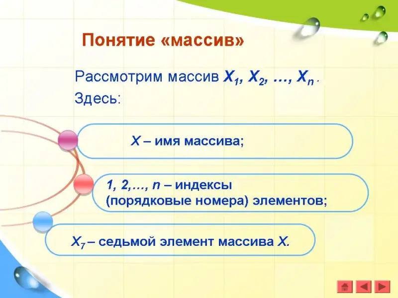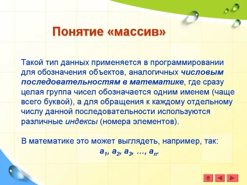 Массив - это составной объект, образованный из элементов (компонент) одного и того же типа. Такой тип данных применяется в программировании для обозначения объектов, аналогичных числовым последовательностям в математике, где сразу целая группа чисел обозначается одним именем (чаще всего буквой), а для обращения к каждому отдельному числу данной последовательности используются различные индексы (номера элементов). В математике это может выглядеть, например, так: