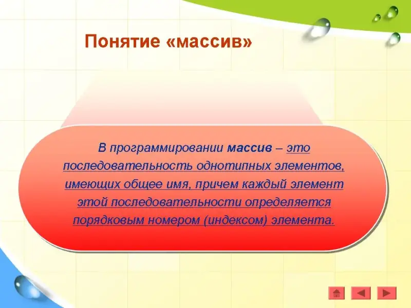 Таким образом, в программировании массив - это последовательность однотипных элементов, имеющих общее имя, причем каждый элемент этой последовательности определяется порядковым номером (индексом) элемента.