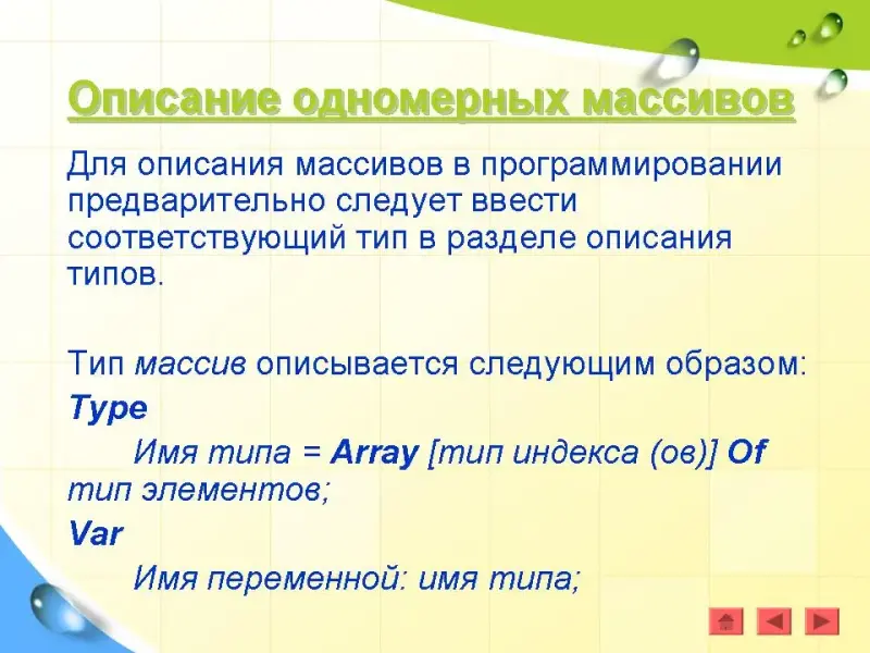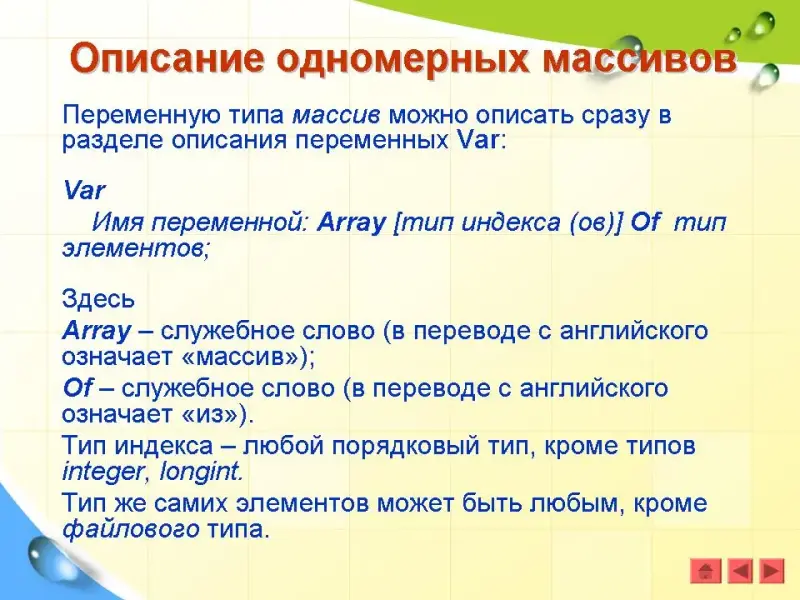 Var Имя переменной: array [тип индекса (ов)] Of тип элементов;