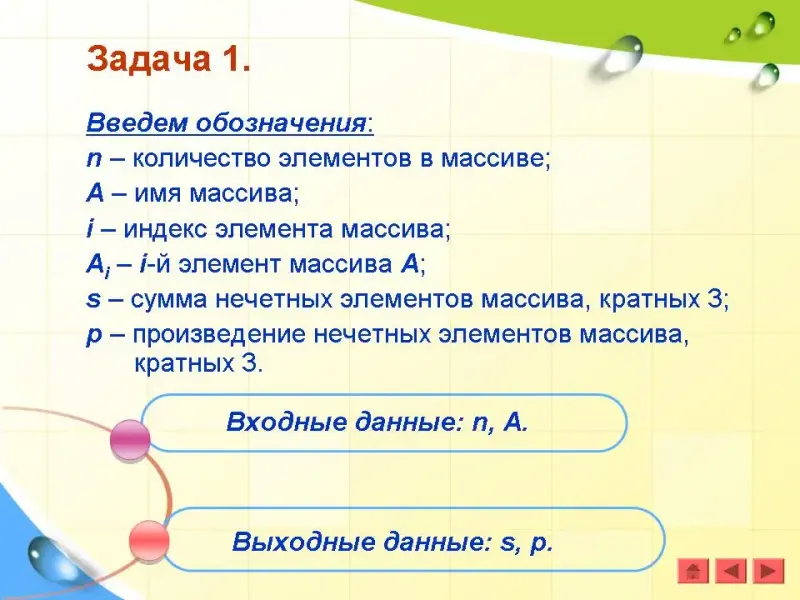 Введем обозначения: n - количество элементов в массиве; А - имя массива; i - индекс элемента массива; Ai - i-й элемент массива A; s - сумма нечетных элементов массива, кратных 3; p - произведение нечетных элементов массива, кратных 3.