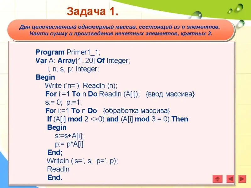 Первоначально сумма искомых элементов равна нулю: не просуммировано ни одно слагаемое, то есть s:=0. Далее, используя любой оператор цикла, просматриваем весь массив от первого и до последнего элемента. И если при этом элемент массива нечетный и кратен 3, то к уже накопленной сумме добавляется очередное слагаемое, т.е. s:= s + A[i]. Здесь слева и справа от знака присваивания записано имя одной и той же переменной s, именно это обеспечивает постепенное накопление суммы: s справа - уже вычисленное известное значение суммы, s - ее новое, вычисляемое значение.