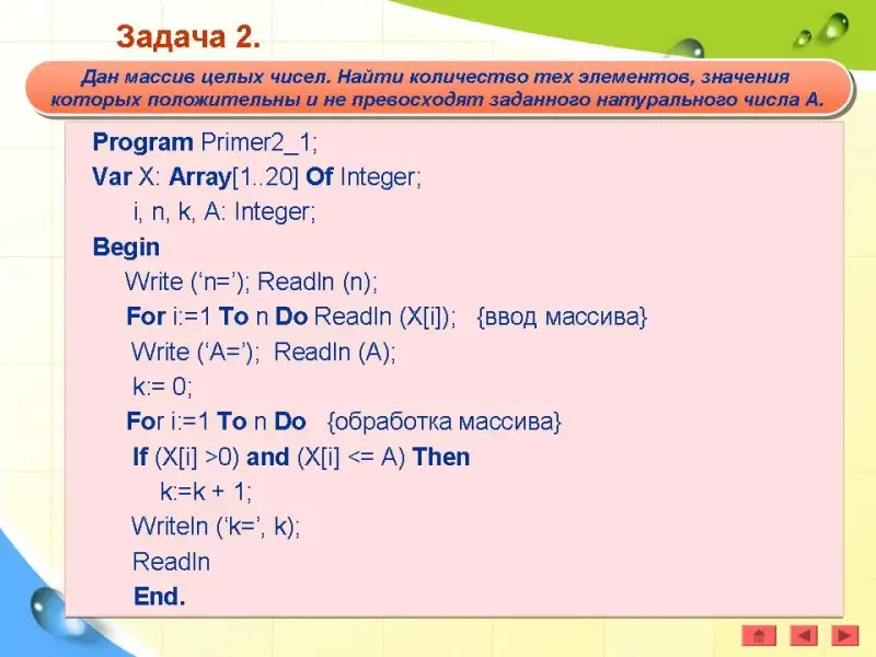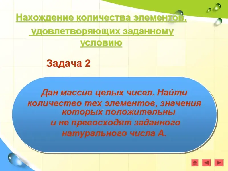Задача 2. Дан массив целых чисел. Найти количество тех элементов, значения которых положительны и не превосходят заданного натурального числа А. (Презентация)