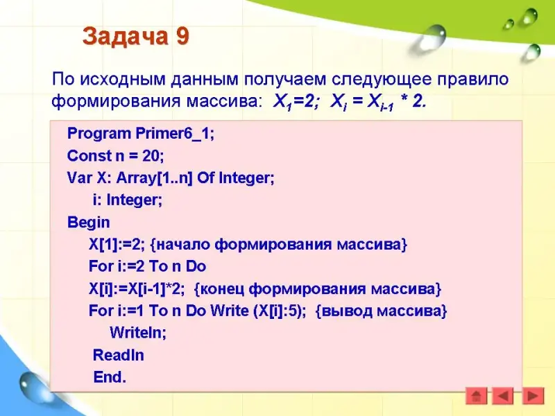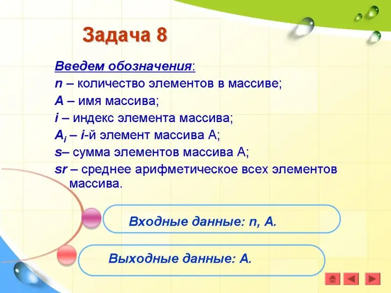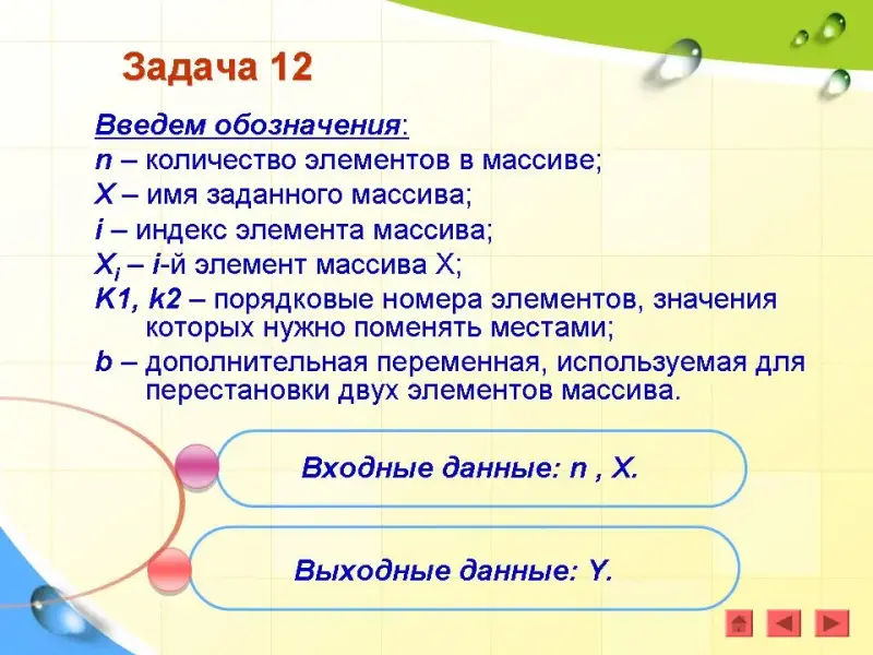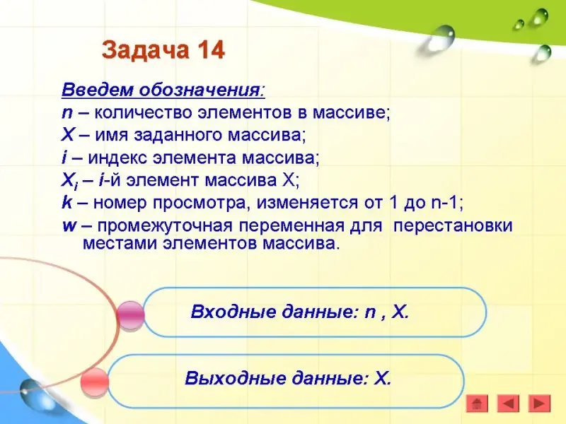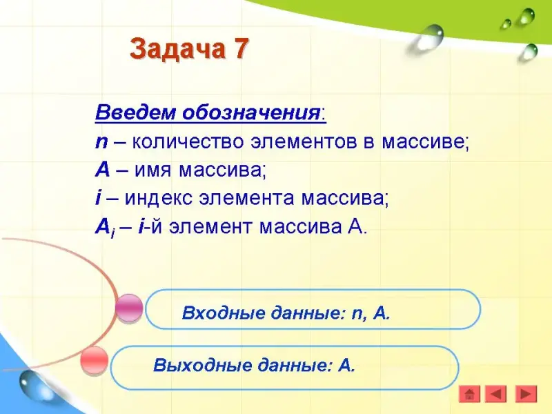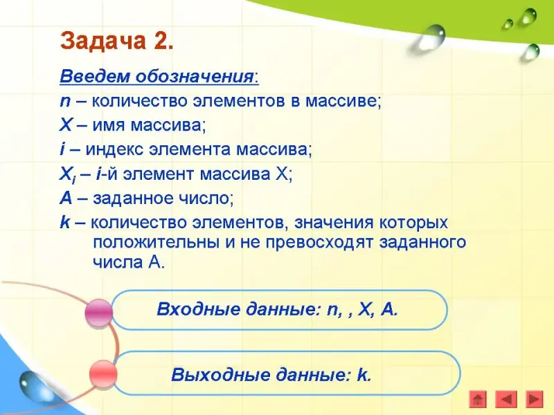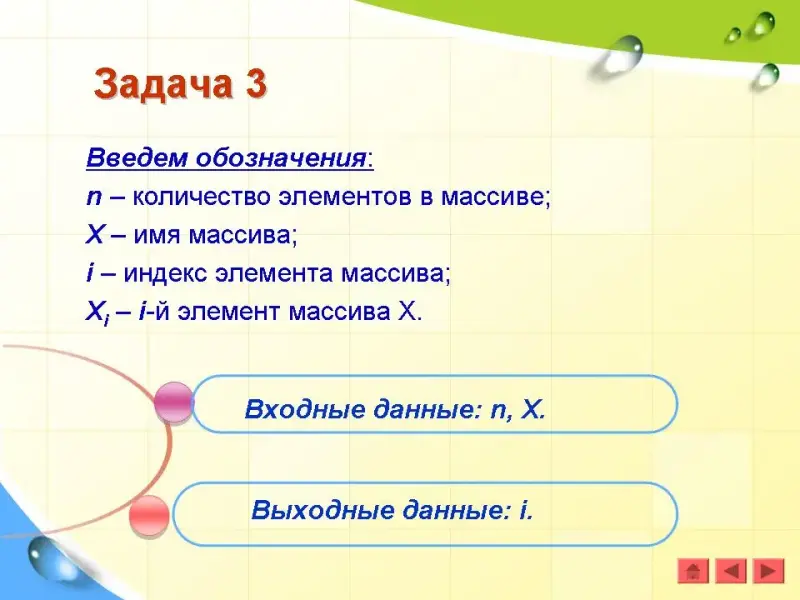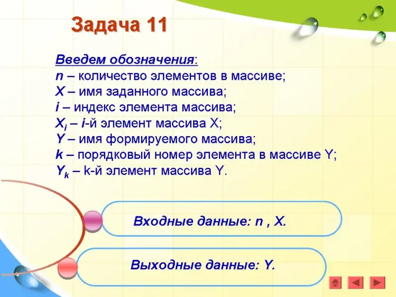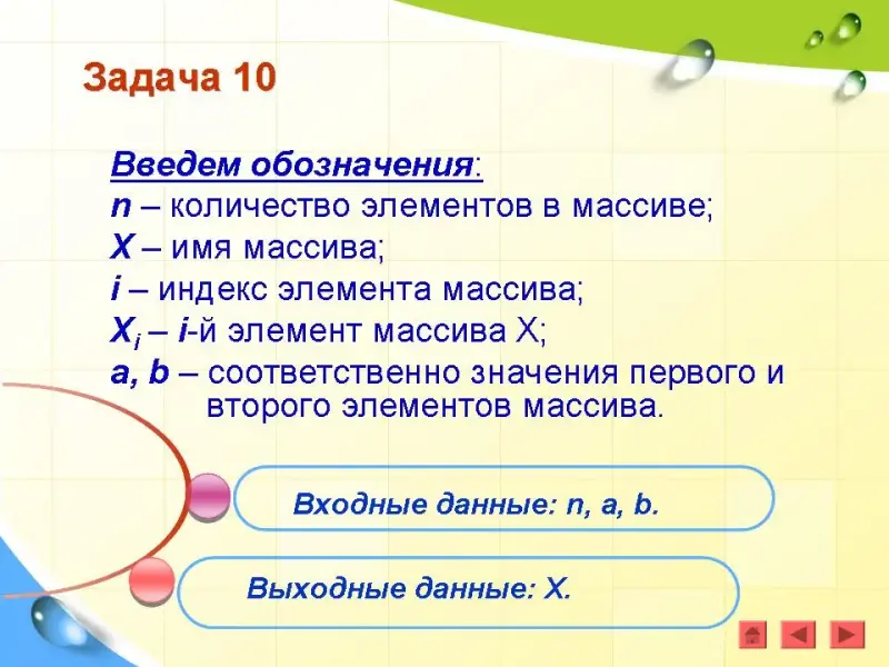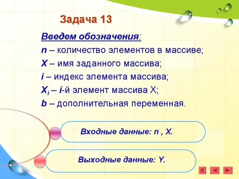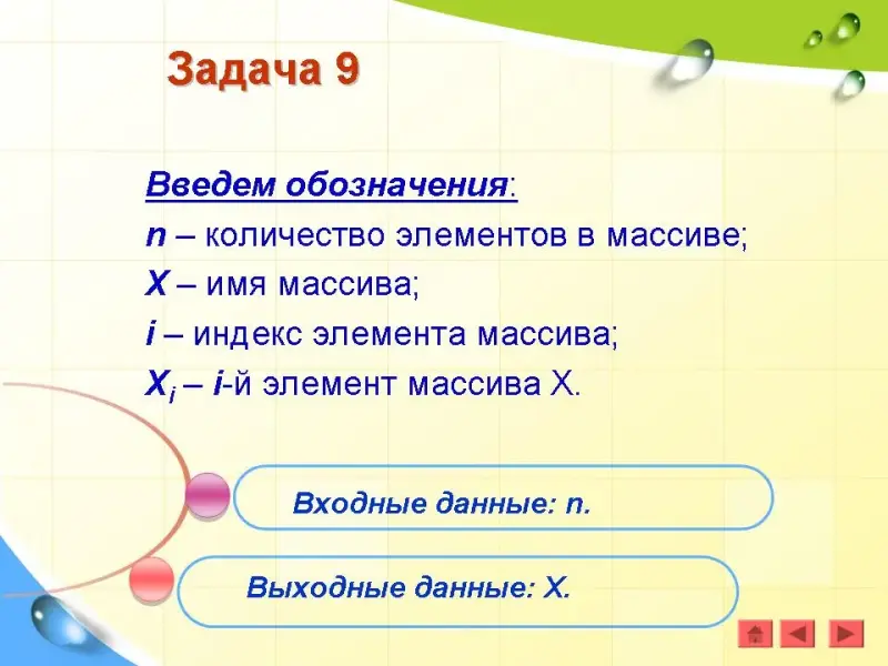 Введем обозначения: n - количество элементов в массиве; X - имя массива; i - индекс элемента массива; Xi - i-й элемент массива Х.