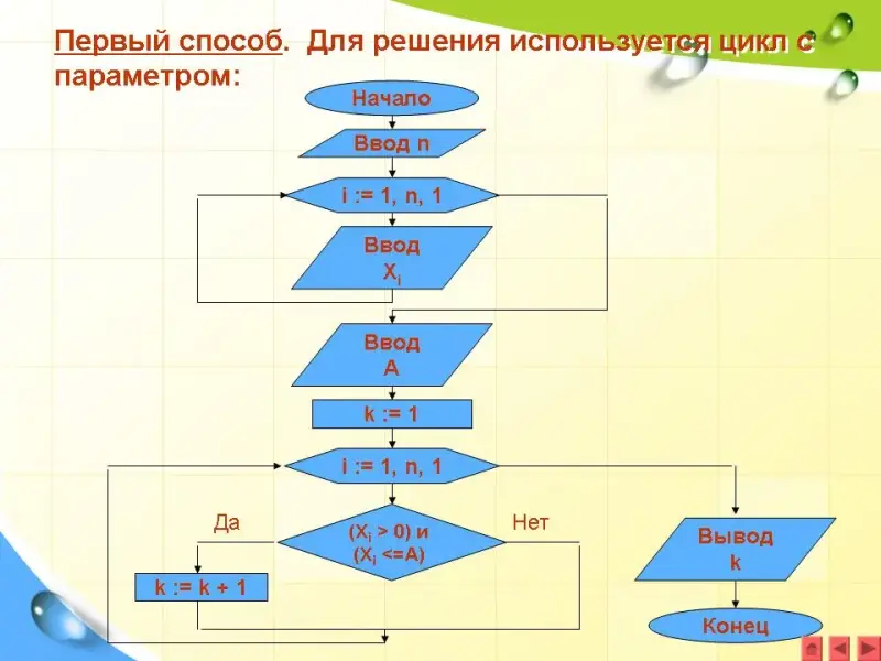 Вводим с клавиатуры значение числа А. Количество элементов, значения которых положительны и не превосходят заданного числа А, вначале полагаем равным нулю, то есть k:=0. Если очередной элемент массива положителен и не превосходят заданного числа A, то количество таких элементов нужно увеличить на единицу, то есть k:=k + 1. Таким образом, обрабатываются все элементы массива.