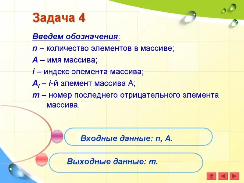 Введем обозначения: n - количество элементов в массиве; А - имя массива; i - индекс элемента массива; Ai - i-й элемент массива A; m - номер последнего отрицательного элемента массива.