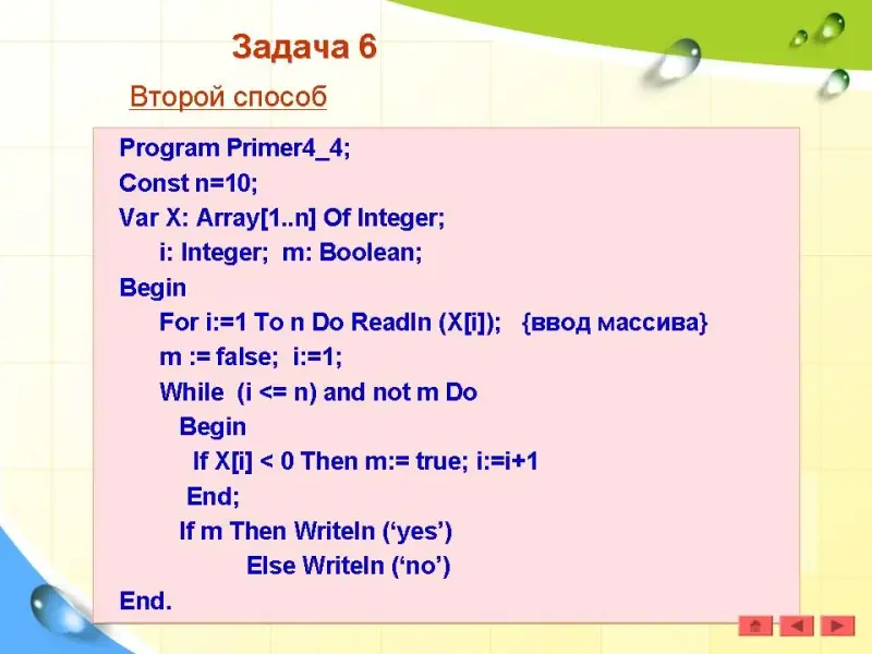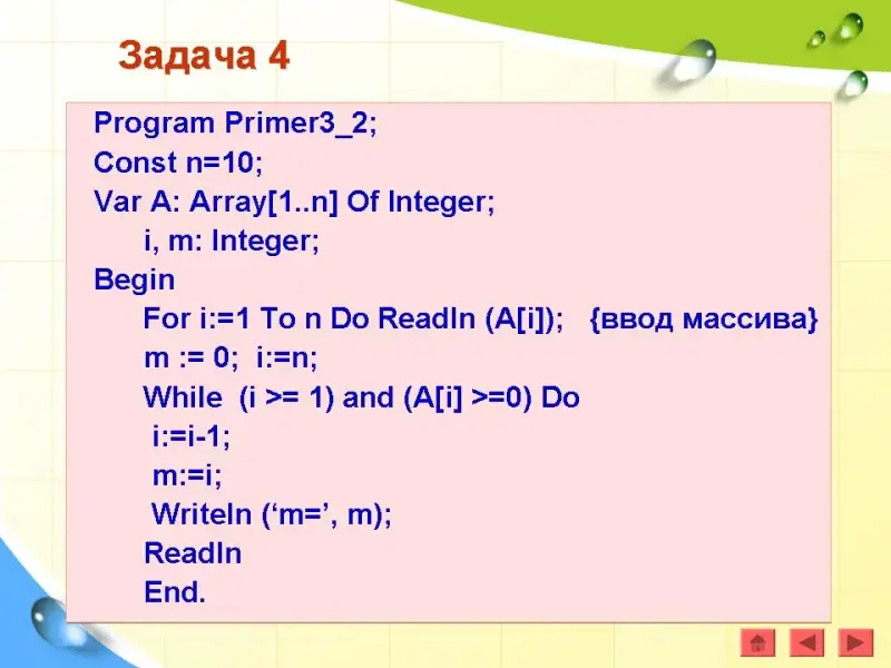 Последний отрицательный элемент массива - это первый отрицательный элемент, который встретится при просмотре массива с конца. Если очередной элемент не является отрицательным, то нужно уменьшать значение текущего индекса (i:=i-1), пока он не станет меньше номера первого элемента или не будет найден отрицательный элемент. Переменная m получает значение i (номер отрицательного элемента), т.е. m := i. Если в массиве нет отрицательного элемента, то значение переменной m остается равным нулю.