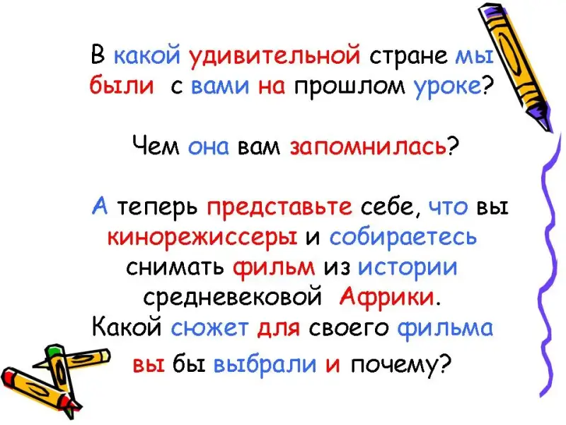 - А теперь представьте себе, что вы кинорежиссеры и собираетесь снимать фильм из истории средневековой Африки. Какой сюжет для своего фильма вы бы выбрали и почему?
