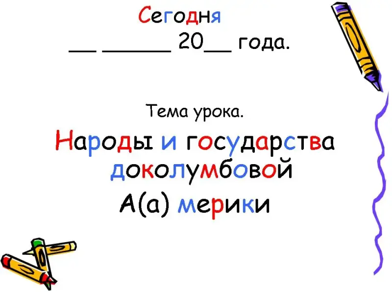 - Этим мы сейчас и займемся, открываем свои тетради, записываем число (Слайд № _____) сегодня «двадцать пятое декабря», тема урока «Народы и государства доколумбовой А (а)мерики» (А как вы напишите название страны?)
