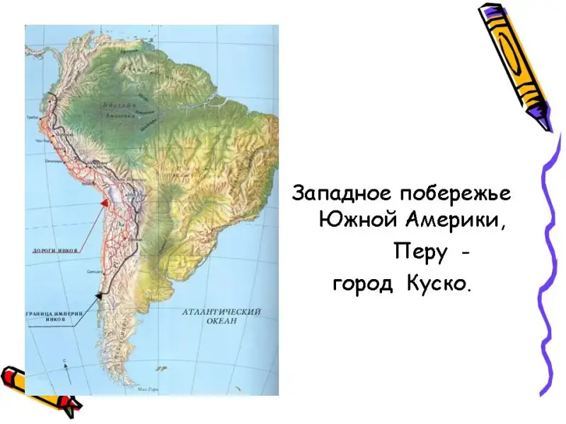 Рассмотрим карту, показывающую расселение майя, ацтеков и инков. (Слайд № _____) Майя проживали на полуострове Юкатан, ацтеки заселили территорию Мексиканского плоскогорья (ст.Теночтитлан), а инки основались на западе Южной Америки в центральных Андах. На западе Южной Америки раскинулась страна инков Перу - с центром в городе Куско. Слайд № ___ (Показываю на карте).