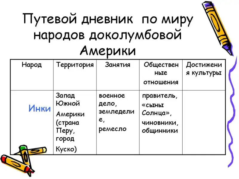 - Мы с вами сейчас были очевидцами событий племени инков и давайте еще раз обратимся к истории индейского племени инков и обратим свой взгляд на наш волшебный экран и начинаем заполнять путевой дневник (показ слайдов № ______).