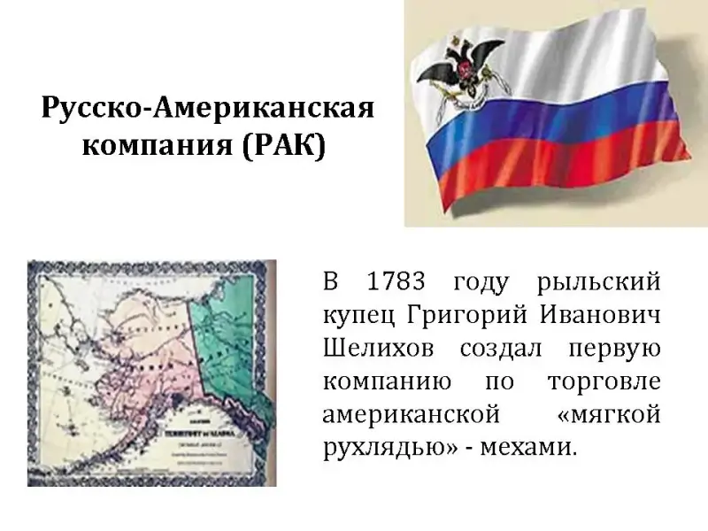Прежде всего в этом же 1783 году создал первую компанию по торговле американской "мягкой рухлядью" - мехами, называвшуюся Русско-Американской или РАК. Эта компания получила от Императора Павла I